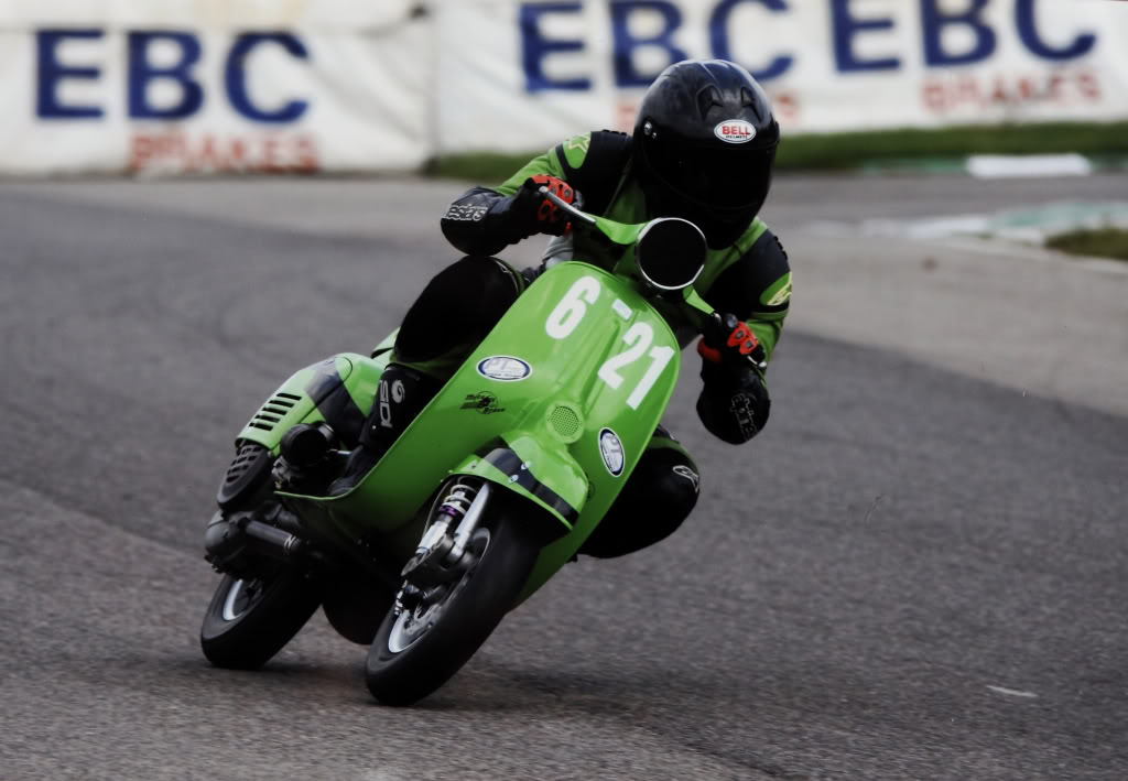 The lights change. I’m now in race mode,nothing else matters. The little green Vespa sounds angry as it accelerates towards the first corner. I’m tugging the bars left and right to miss the slower machines. Quick pull on the right bar sends the 90ss turning left , hard up the hill. I’m still in third.. should be in top with the right gearing.. power on hard around ‘charlies’ onto the park straight. Apex and still in third.. not good.. finally the red shift light tells me 10,500 rpm so I change to 4th..no chance of seeing it light again I don’t think. Park corner.. I look for the markers on the left, 300,200,100m. I ignore them all.. quick dab on the rear brake and back to third.. now flat, hard through chris curve , no letting off. The throttle is on the stops. 4th gear.. James is ahead.. he must be in third or fourth place I think. I’ll stick here and try to pass when its safe. The gooseneck is a complex that deserves respect..its a right into a left whilst going downhill. Mid turn the bike loses weight.. you have to be very firm with it here.. down to mansfield..I hate this corner but we are through. Into top briefly before the first gear chicane..my Vespa is weaving side to side..I think the rear wheel is almost in the air..I ginger through it..its at these slow corners I tend to lose grip due to my weight.. HELL what has happened.. there’s a lambretta on its side and the rider is tumbling ahead of me only inches from my front wheel. Brakes hard on..I can’t squash him..that wouldnt be right. Oh dear,I’m on the grass again..I’m sure Stuart Day is only millimetres from me and I’m waiting for the impact. Ed Hocking overtakes us both,on the grass to the right. I don’t think he meant to,I don’t think he could stop!