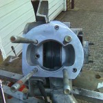 Group 4 rules allows certain homologated barrels within the rules. Welding to increase port area or use of reed valves is illegal in the class as is machining the spigot or moving the barrel studs. I planned to get the Fabrizi homologated at some point, or at least propose the barrel but first I had to have a running engine that was producing the power. The problem with the Fabrizi is that it required a spigot machine to fit the barrel. I got around this by the use of a longer conrod. This allowed me the use of a packer plate that I could machine to the standard spigot size of 61.5mm (approx) and then machine a step into that to accomodate the oversize neck of the Fabrizi barrel.